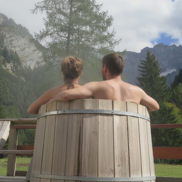 Une expérience de bien-être à partager à deux ou deux parents et un enfant jusqu’à 5 ans – dans un bain salin chauffé au feu de bois, installé en plein air au cœur du vallon de Nant. Préparé dans un tonneau en mélèze, ce bain offre une chaleur douce et constante entre 37° et 40°, idéale pour détendre les muscles et calmer l’esprit.