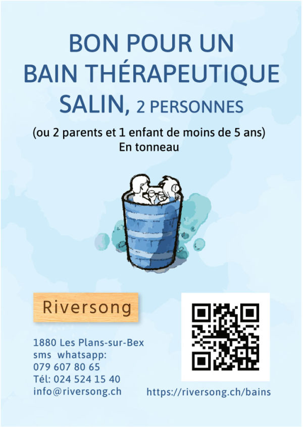Offrez un bain salin en plein air, chauffé de manière éco-responsable au bois at à l’énergie solaire, dans un tonneau en mélèze prévu pour deux personnes — ou pour deux parents accompagnés d’un enfant jusqu’à 5 ans. L’eau chaude, entre 37° et 40°, est enrichie en sel naturel des Alpes, reconnu pour ses vertus apaisantes et reminéralisantes. Chaque bain est préparé sur mesure : l’eau est changée après chaque utilisation et ne contient ni chlore ni additifs. Bain salin sain 0,9%, chauffé au solaire et au feu de bois. Après l’usage, l’eau salée à 0,9% (même teneur en sel qu’une larme) est redonnée à la terre, d’où elle provient, dans le complet respect de la nature.